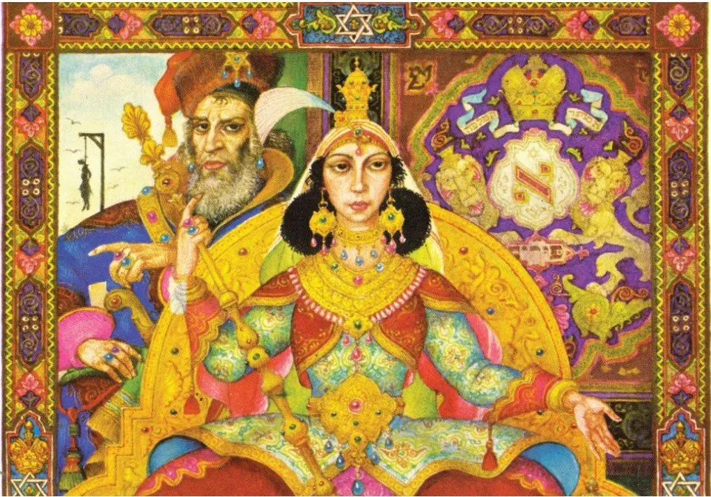 Szyk’s art is often shocking or outrageous, with styles ranging from cartoonism to classical Baroque. Here is a taste … his depiction of Esther and Mordechai: